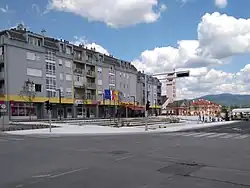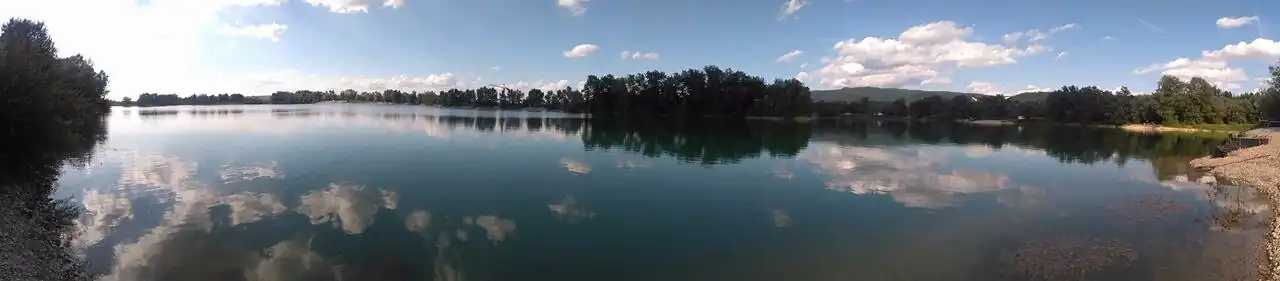 Zaprešić is a part of the metropolitan area of Croatia's capital and largest city, Zagreb. It is located 18 kilometres (11 mi) northwest of Zagreb, lying near the confluence of the Krapina River, and the Sava River.[18] The small Lužnica River marks the western border of Zaprešić.[19] The Zaprešić metropolitan area consists of Zaprešić and seven surrounding municipalities: Bistra, Brdovec, Dubravica, Jakovlje, Luka, Marija Gorica, and Pušća.[9] It is located in the northwestern part of Zagreb County, bordered on the south by the Sava River, on the east by Zagreb and the Medvednica Mountain, and on the west by the Sutla River and the Slovenian border. According to the official website, three distinct geographic areas make up the Zaprešić area: the western part of the Medvednica Mountain, the Marija Gorica Hills and the plains that lie between. The western part of the Medvednica Mountain is fairly lightly inhabited, with no settlements except at the base of the mountain. These include the Bistra municipality and the Zaprešić settlement of Jablanovec. The Marija Gorica Hills are located mainly in the Marija Gorica municipality between the rivers of Krapina, and Sutla. The third area, the plains, is the area where the Zaprešić itself is located.[18] Zaprešić has a lake, Lake Zajarki, situated between the town and the river Sava in the south. It is colloquially known as Bager (Croatian word for excavator). The lake is currently still used as a gravel pit, although it is a known destination for Zaprešić swimmers and beach goers, as well as local people and foreign tourists who do recreational fishing.[20] Fishing activities on lake Zajarki are regulated by Šrd Šaran, Zaprešić.[21] In 2017. the picnic zone was built on eastern side of a big lake which includes barbecue houses and beach volleyball, handball and football fields.[22]