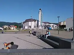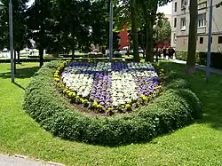 ![]() ![]() ![]() ![]() ![]() Top: A gothic chapel in Novi Dvori; Center left: High-rise buildings in city centre; Center right: Square of Pope John Paul II; Bottom left: Franjo Tuđman Square; Bottom right: Zaprešić coat of arms shaped garden in city centre | |