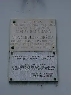 In 1903, Zaprešić railway station was a hotspot of two anti-Hungarian riots caused by Khuen Hedervary's magyarization policy and breaking of Croatian–Hungarian Settlement of 1868 by installing Hungarian national symbols on railway objects across Croatia. These demonstrations were part of a wider national movement that swept the country at a time. In both occasions the demonstrations turned into a scuffle with local gendarmes which ended up with several peasants killed and dozens of locals arrested. Peasants that were killed or injured by the gendarmes are traditionally celebrated as a heroes and national martyrs. In their honour, two separate memorial boards were placed on the building of Zaprešić railway station in 1928. and 2003.[14] After the First World War, the oldest meat industry in Croatia, the Industrija mesnih proizvoda, was founded.[10]
