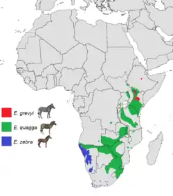 Modern range of the three living zebra species