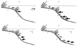 Changes in the spatial distribution of some fish species in the littoral (1), sublittoral (2) and pelagic (3) zones of Lake Pleshcheyevo before (a, c) and after (b, d) the introduction of zebra mussels: a - roach in 1978-1981, b - the same in 2014-2016, c - bream (black) and silver bream (gray) in 1978-1981, d - the same in 2014-2015.[75]