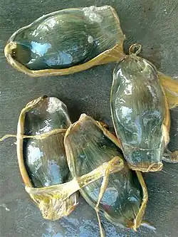 The courtship behavior of the zebra shark consists of the male following the female and biting vigorously at her pectoral fins and tail, with periods in which he holds onto her pectoral fin and both sharks lie still on the bottom. On occasion this leads to mating, in which the male curls his body around the female and inserts one of his claspers into her cloaca. Copulation lasts for two to five minutes.[15] The zebra shark is oviparous, with females laying large egg capsules measuring 17 cm (6.7 in) long, 8 cm (3.1 in) wide, and 5 cm (2.0 in) thick. The egg case is dark brown to purple in color, and has hair-like fibers along the sides that secure it to the substrate.[5] The adhesive fibers emerge first from the female's vent; the female circles vertical structures such as reef outcroppings to entangle the fibers, so as to anchor the eggs. Females have been documented laying up to 46 eggs over a 112-day period.[15] Eggs are deposited in batches of around four.[5] Reproductive seasonality in the wild is unknown.[1]
