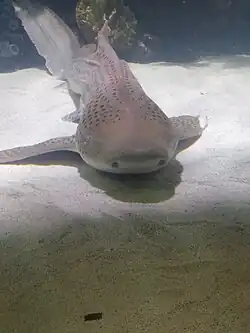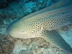The genus name is derived from the Greek stego meaning "covered", and stoma meaning "mouth".[2] The specific epithet fasciatum means "banded", referring to the striped pattern of the juvenile.[3] The juvenile coloration is also the origin of the common name "zebra shark". The name "leopard shark" is sometimes applied to the spotted adult, but that name usually refers to the houndshark Triakis semifasciata, and is also sometimes used for the tiger shark (Galeocerdo cuvier).[4] Due to their different color patterns and body proportions, both juveniles and subadults have historically been described as separate species (Squalus tigrinus and S. longicaudatus respectively).[5]