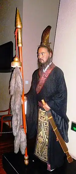 Zhang Qian (Chinese: 張騫; died c. 114 BC)[1] was a Chinese diplomat, explorer, and politician who served as an imperial envoy to the world outside of China in the late 2nd century BC during the Western Han dynasty. He was one of the first official diplomats to bring back valuable information about Central Asia, including the Greco-Bactrian remains of the Macedonian Empire as well as the Parthian Empire, to the Han dynasty imperial court, then ruled by Emperor Wu of Han.