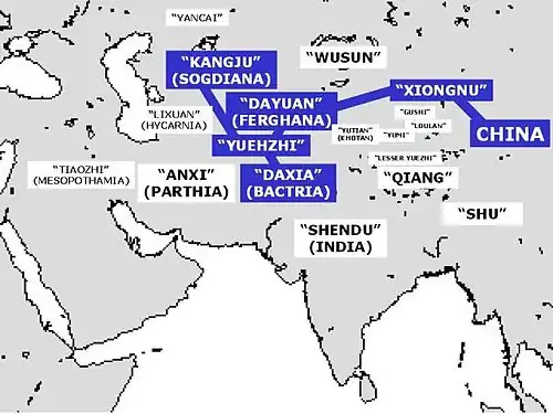 Countries described in Zhang Qian's report. Visited countries are highlighted in blue.