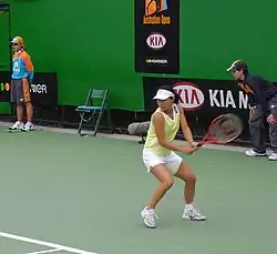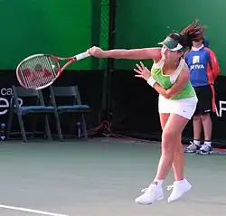 At the end of the month, she advanced to the second round at the US Open by defeating Iveta Benešová.[12] Further first-round wins in September over María Vento-Kabchi (at Bali) and Jelena Janković (at Beijing) could not be consolidated on in subsequent rounds of the respective tournaments;[12] but at Guangzhou, the last tournament she would play all year, she reached the semifinal with wins over Carly Gullickson, Jamea Jackson and Maria Kirilenko,[12] before suffering her second loss of the year to Nuria Llagostera Vives.[9] This string of results lifted her to a career-high world ranking of 42 in early October 2005.[2]