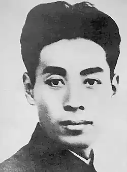 When Nankai became a university in August 1919, Zhou was in the first class, but was an activist full-time. His political activities continued to expand, and in September, he and several other students agreed to establish the "Awakening Society", a small group, never numbering more than 25.[33] In explaining the goals and purpose of the Awakening Society, Zhou declared that "anything that is incompatible with progress in current times, such as militarism, the bourgeoisie, partylords, bureaucrats, inequality between men and women, obstinate ideas, obsolete morals, old ethics... should be abolished or reformed", and affirmed that it was the purpose of the Society to spread this awareness among the Chinese people. It was in this society that Zhou first met his future wife, Deng Yingchao.[34] In some ways, the Awakening Society resembled the clandestine Marxist study group at Peking University headed by Li Dazhao, with the group members using numbers instead of names for "secrecy". (Zhou was "Number Five", a pseudonym which he continued to use in later years.)[35] Indeed, immediately after the group was established, it invited Li Dazhao to give a lecture on Marxism.