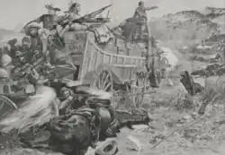 In the 1880s, European colonists arrived with Cecil Rhodes's British South Africa Company (chartered in 1889). In 1888, Rhodes obtained a concession for mining rights from King Lobengula of the Ndebele peoples.[33] He presented this concession to persuade the government of the United Kingdom to grant a royal charter to the company over Matabeleland, and its subject states such as Mashonaland as well.[34] Rhodes used this document in 1890 to justify sending the Pioneer Column, a group of Europeans protected by well-armed British South Africa Police (BSAP) through Matabeleland and into Shona territory to establish Fort Salisbury (present-day Harare), and thereby establish company rule over the area. In 1893 and 1894, with the help of their new Maxim guns, the BSAP would go on to defeat the Ndebele in the First Matabele War. Rhodes additionally sought permission to negotiate similar concessions covering all territory between the Limpopo River and Lake Tanganyika, then known as "Zambesia".[34] In accordance with the terms of aforementioned concessions and treaties,[34] mass settlement was encouraged, with the British maintaining control over labour as well as over precious metals and other mineral resources.[35]