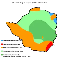 Zimbabwe has a subtropical climate with many local variations. The southern areas are known for their heat and aridity, while parts of the central plateau receive frost in winter. The Zambezi valley is known for its extreme heat, and the Eastern Highlands usually experience cool temperatures and the highest rainfall in the country. The country's rainy season generally runs from late October to March, and the hot climate is moderated by increasing altitude. Zimbabwe is faced with recurring droughts. In 2019, at least 55 elephants died because of drought.[121] Severe storms are rare.[122]