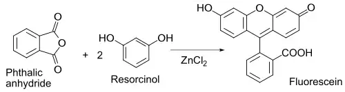 Related Lewis-acid behavior is illustrated by a traditional preparation of the dye fluorescein from phthalic anhydride and resorcinol. The key reaction is a Friedel-Crafts acylation:[50]