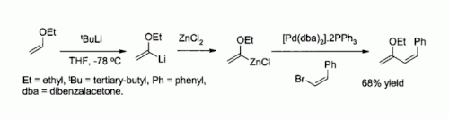 Being inexpensive and anhydrous, ZnCl2 is a widely used for the synthesis of many organozinc reagents, such as those used in the palladium catalyzed Negishi coupling with aryl halides or vinyl halides. The prominence of this reaction was highlighted by the award of the 2010 Nobel Prize in Chemistry to Ei-ichi Negishi.[58]