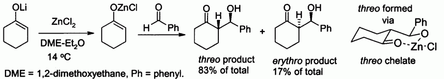 Zinc enolates, prepared from alkali metal enolates and ZnCl2, provide control of stereochemistry in aldol condensation reactions. This control is attributed to chelation at the zinc centre. In the example shown below, the threo product was favored over the erythro by a factor of 5:1 in the presence of ZnCl2.[57]