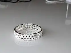 This bracelet has zircon gemstones. The metal is zinc alloy base with silver coating.