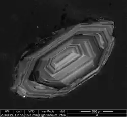 Zircon has played an important role during the evolution of radiometric dating. Zircons contain trace amounts of uranium and thorium (from 10 ppm up to 1 wt%)[15] and can be dated using several modern analytical techniques. Because zircons can survive geologic processes like erosion, transport, and even high-grade metamorphism, they contain a rich and varied record of geological processes. Currently, zircons are typically dated by uranium–lead (U–Pb), fission-track, and U+Th/He techniques. Imaging the cathodoluminescence emission from fast electrons can be used as a prescreening tool for high-resolution secondary-ion mass spectrometry (SIMS) to image the zonation pattern and identify regions of interest for isotope analysis. This is done using an integrated cathodoluminescence and scanning electron microscope.[40] Zircons in sedimentary rock can identify the sediment source.[41]