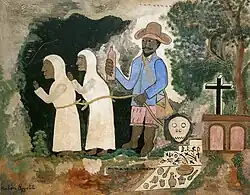 1946 painting by Haitian artist Hector Hyppolite, of a bokor (with Baron Samedi iconography), engaged in body snatching from a cemetery in order to create zombies to serve him.