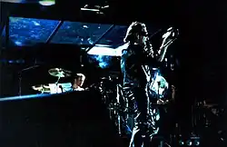 To enable such a complex video production, the equivalent of a television studio control room was built for the tour.[16][32] Williams enlisted Carol Dodds to be video director based on their experience together on Bowie's Sound+Vision Tour and her familiarity with Vidiwalls from a Paula Abdul tour.[33][34] Dodds operated the tour's "custom-designed interactive video system",[35] and oversaw a crew ranging from 12 people on the arena legs to 18 for the "Outside Broadcast" leg.[36][33] At the front of house position, the video crew conducted a live mix of the broadcast cameras filming the concert and live television transmissions intercepted by a satellite dish.[37] In the production facility underneath the stage, dubbed "Underworld", engineers intercut the video from the live mix with pre-recorded imagery from LaserDisc players, video tape players, and a Philips CD-i player and routed it to the display screens. In all, content was compiled from 24 different video sources.[33][37][38]