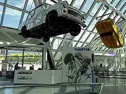 Lighting equipment was provided by LSD.[20][42] Supplementing the traditional lighting rigs were several suspended Trabants that had been retrofitted with light fixtures. The cars were purchased for US$500–600 each, and when stripped of their interiors, they weighed 900 pounds (410 kg). Approximately US$10,000 of lighting equipment weighing 400 pounds (180 kg) was installed in the vehicles.[45] A 2.5K HMI Fresnel fixture was mounted to the metal bar that previously held the vehicle's backseat, and was fitted with an LSD ColourMag colour magazine and a dowser; a 5K fixture was originally used but had to be replaced after causing the car to melt after five minutes. Other fixtures installed were: a PAR-64 Ray Light reflector in the headlight bracket; two LSD Mirrorstrobes; eight Molefays behind the front bumper and four behind the rear; and ACL strips behind the radiator grid.[20][34] Chain hoists were attached to brackets welded onto the wheel hubs, allowing the vehicles to be raised and tilted on their own axles.[20]