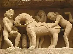 There are a few references in Hindu temples to figures engaging in symbolic sexual activity with animals such as explicit depictions of people having sex with animals included amongst the thousands of sculptures of "Life events" on the exterior of the temple complex at Khajuraho. The depictions are largely symbolic depictions of the sexualization of some animals and are not meant to be taken literally.[52] According to the Hindu tradition of erotic painting and sculpture, having sex with an animal is believed to be actually a human having sex with a god incarnated in the form of an animal.[53] In some Hindu scriptures, such as the Bhagavata Purana and the Devi Bhagavata Purana, having sex with animals, especially the cow, leads one to hell, where one is tormented by having one's body rubbed on trees with razor-sharp thorns.[54] Similarly, the Manusmriti in verse 11.173 also condemns the act of bestiality and prescribes punishments for it: