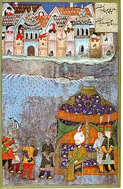 A 16th century Ottoman miniature depicting the surrender of Becskerek to Sokullu Mehmed Pasha, 1551. Futūhāt-i jamīla