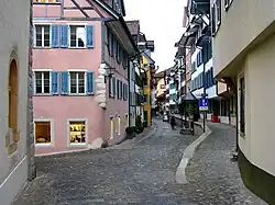 In the course of the high medieval town construction, the settlement of Zug also received a town wall at some point after 1200. The town founders were probably the counts of Kyburg. The town, first mentioned in AD 1240, was called an "oppidum" in 1242 and a "castrum" in 1255. In 1273, it was bought by Rudolph of Habsburg from Anna, the heiress of Kyburg and wife of Eberhard, head of the cadet line of Habsburg.[3] Through this purchase it passed into the control of the Habsburgs and was placed under a Habsburg bailiff. The Aeusser Amt or Outer District consisted of the villages and towns surrounding Zug, which each had their own Landsgemeinden but were ruled by a single Habsburg bailiff. Zug was important as an administrative center of the Kyburg and the Habsburg district, then as a local market place, and, thereafter, as a stage town for the transport of goods (particularly salt and iron) over the Hirzel hill towards Lucerne.
