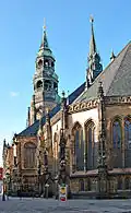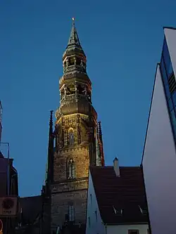 Its nine churches include the Gothic church of St. Mary (1451–1536), with a spire 285 ft (87 m) high and a bell weighing 51 tons. The church contains an altar with wood carvings, eight paintings by Michael Wohlgemuth and a pietà in carved and painted wood by Peter Breuer.