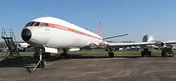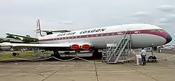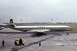 The Comet 4 first flew on 27 April 1958 and received its Certificate of Airworthiness on 24 September 1958; the first was delivered to BOAC the next day.[127][128] The base price of a new Comet 4 was roughly £1.14 million (£29.95 million in 2023).[129] The Comet 4 enabled BOAC to inaugurate the first regular jet-powered transatlantic services on 4 October 1958 between London and New York (albeit still requiring a fuel stop at Gander International Airport, Newfoundland, on westward North Atlantic crossings).[69] While BOAC gained publicity as the first to provide transatlantic jet service, by the end of the month rival Pan American World Airways was flying the Boeing 707 on the New York-Paris route, with a fuel stop at Gander in both directions,[130] and in 1960 began flying Douglas DC-8's on its transatlantic routes as well. The American jets were larger, faster, longer-ranged and more cost-effective than the Comet.[131] After analysing route structures for the Comet, BOAC reluctantly cast-about for a successor, and in 1956 entered into an agreement with Boeing to purchase the 707.[132]