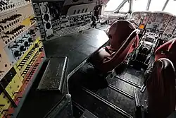 For ease of training and fleet conversion, de Havilland designed the Comet's flight deck layout with a degree of similarity to the Lockheed Constellation, an aircraft that was popular at the time with key customers such as BOAC.[18] The cockpit included full dual-controls for the captain and first officer, and a flight engineer controlled several key systems, including fuel, air conditioning and electrical systems.[37] The navigator occupied a dedicated station, with a table across from the flight engineer.[38]