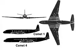 The Comet was an all-metal low-wing cantilever monoplane powered by four jet engines; it had a four-place cockpit occupied by two pilots, a flight engineer, and a navigator.[28] The clean, low-drag design of the aircraft featured many design elements that were fairly uncommon at the time, including a swept-wing leading edge, integral wing fuel tanks, and four-wheel bogie main undercarriage units designed by de Havilland.[28] Two pairs of turbojet engines (on the Comet 1s, Halford H.2 Ghosts, subsequently known as de Havilland Ghost 50 Mk1s) were buried in the wings.[29]