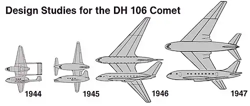 A design team was formed in 1946 under the leadership of chief designer Ronald Bishop, who had been responsible for the Mosquito fighter-bomber.[9] Several unorthodox configurations were considered, ranging from canard to tailless designs;[N 4] All were rejected. The Ministry of Supply was interested in the most radical of the proposed designs, and ordered two experimental tailless DH 108s[N 5] to serve as proof of concept aircraft for testing swept-wing configurations in both low-speed and high-speed flight.[5][11] During flight tests, the DH 108 gained a reputation for being accident-prone and unstable, leading de Havilland and BOAC to gravitate to conventional configurations and, necessarily, designs with less technical risk.[12] The DH 108s were later modified to test the DH.106's power controls.[13]