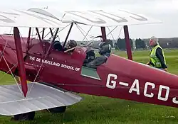 One of the main changes from the preceding Moth series was improved access to the front cockpit, since the training requirement specified that the front-seat occupant had to be able to escape easily, especially when wearing a parachute.[6][4] Access to the front cockpit of the Moth's predecessors was restricted by the proximity of the aircraft's fuel tank, directly above the front cockpit, and the rear cabane struts for the upper wing. The solution adopted was to shift the upper wing forward but sweep the wings back to maintain the same centre of lift.[7][4] Other changes included a strengthened structure, fold-down doors on both sides of the cockpit, and a revised exhaust system.[6]