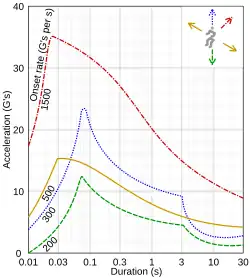 Human tolerances depend on the magnitude of the gravitational force, the length of time it is applied, the direction it acts, the location of application, and the posture of the body.[9][10]: 350