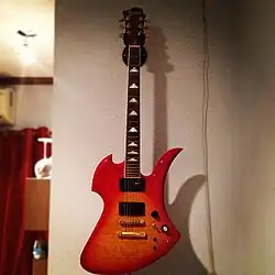 Hide was a fan of Bow Wow guitarists Kyoji Yamamoto and Mitsuhiro Saito, and played the Mockingbird style guitar, which Saito used.[5][98] Hide was rarely seen performing without a Fernandes guitar. He had many signature models with the company.[99] The MG-X "Paint" model features a psychedelic paint job modeled after one that Hide had painted himself.[81] He also owned a large repertoire of guitars by other manufacturers. While in Los Angeles, he purchased a 1959 Gibson Les Paul Standard that was once owned by Mick Mars of Mötley Crüe for 20 million yen.[82][100] As of 2025, it was valued to be worth 100 million yen.[82] The whereabouts of Hide's first electric guitar, a Gibson Les Paul Deluxe that his grandmother bought him through connections at the United States military base in Yokosuka, are unknown. Pata suggested that it was sold during X Japan's indie years when they were struggling financially.[82]