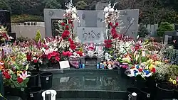 Within a week, three teenage fans had died in copycat suicides. At the wake on May 6, which 10,000 people attended, a 19-year-old girl slit her wrists after laying flowers at the temple, and a car crash caused by sleep-deprived fans traveling from Osaka caused one death and seven serious injuries on a motorway.[30] His remains were buried in Miura Reien in Miura, Kanagawa during a Buddhist memorial service. Approximately 50,000 people attended his funeral at Tsukiji Hongan-ji on May 7, where 56 people were hospitalized and 197 people received medical treatment in first aid tents due to a mixture of emotional exhaustion and heat, with the funeral taking place on the warmest day of the year so far, at 27 degrees Celsius (about 80.6 degrees Fahrenheit).[1][2][30]