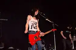 Hide was influenced by hard rock bands such as Iron Maiden, AC/DC and Bow Wow as well as punk rock acts such as The Clash and Sex Pistols.[3] However, Kiss guitarist Ace Frehley was his idol and biggest influence.[3][91][92] He preferred guitarists who make playing look "effortless" and who have "the skill, the looks and the attitude", naming Frehley, Jimmy Page and Joe Perry.[92] He cited Bauhaus' guitarist Daniel Ash as an influence as well.[3] Hide cited Iron Maiden's self-titled debut album for teaching him how to arrange twin guitar parts.[92]