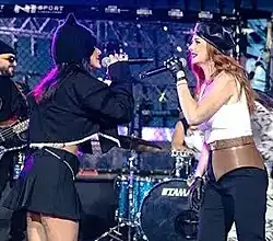 In late 2021, Katina and Volkova announced that t.A.T.u. would return to the stage in 2022 to take part in the official duo tribute concert.[118] However, persistent issues with the ongoing COVID-19 pandemic led to its cancellation.[119] The duo eventually reunited on stage for the first time since their falling out in September 2022, performing at the Dinamo Stadium in Minsk as part of the Ovion Show event.[120] This was followed by another performance at a sporting event at the Gazprom Stadium in Saint Petersburg in May 2023.[121]